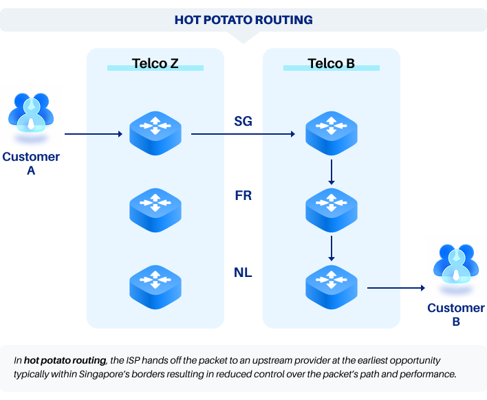 In Singapore’s competitive telecommunications landscape, not all network providers are created equal. While many local carriers claim to offer international connectivity, the reality is that most rely on a practice called “hot potato routing” — handing off your traffic to third-party Tier 1 providers at Singapore’s borders. This approach may reduce costs for the carrier, but it comes at the expense of performance, control, and reliability for customers.