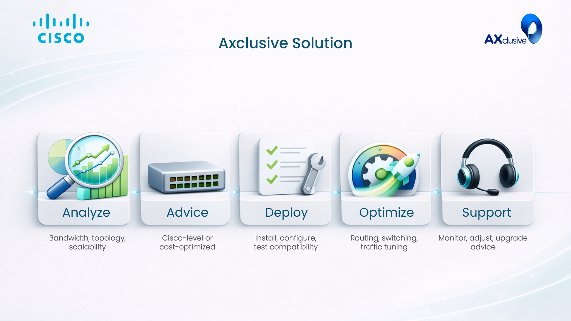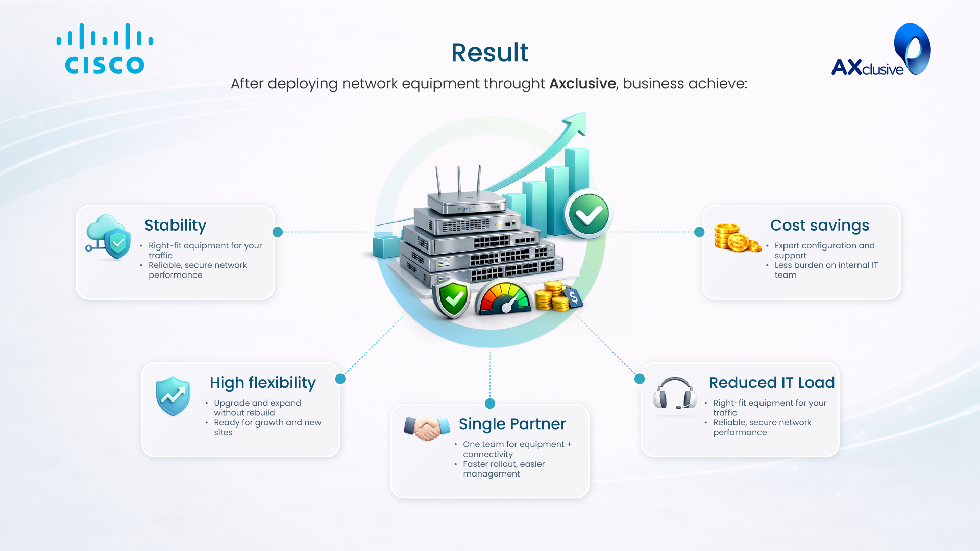 This model helps businesses access the right solution, the right cost and the right technical standards — all guaranteed by Axclusive as a reputable Cisco partner.